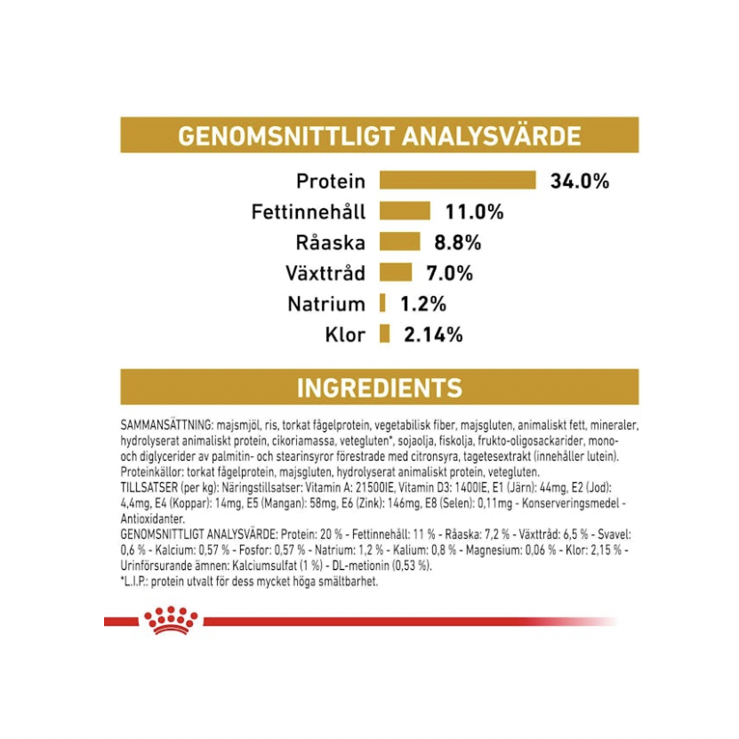 SAMMANSÄTTNING: majsmjöl, ris, torkat fågelprotein, vegetabiliska fibrer, majsgluten, animaliska fetter, mineraler, hydrolysat av animaliska proteiner, cikoriamassa, vetegluten*, sojaolja, fiskolja, frukto-oligosackarider, mono- och diglycerider av palmitin- och stearinsyror förestrade med citronsyra, mjöl av ringblomma.