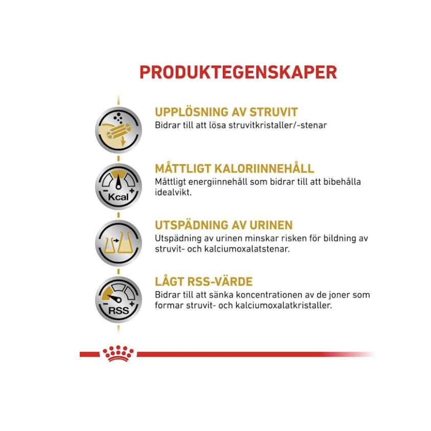 ROYAL CANIN® URINARY S/O MODERATE CALORIE torrfoder är ett dietiskt helfoder för hundar, som är utvecklat för upplösning av struvitsten och minskad risk för återfall i struvitsten. Främjar produktion av undermättad eller metastabiliserad urin med avseende på struvit och/eller har urinförsurande egenskaper. REKOMMENDATION: veterinär bör rådfrågas före användning och före en förlängning av användningstiden. Använd URINARY S/O MODERATE CALORIE torrfoder 5 till 12 veckor för upplösning av struvitsten och inledningsvis i upp till 6 månader för minskad risk för återfall i struvitsten.