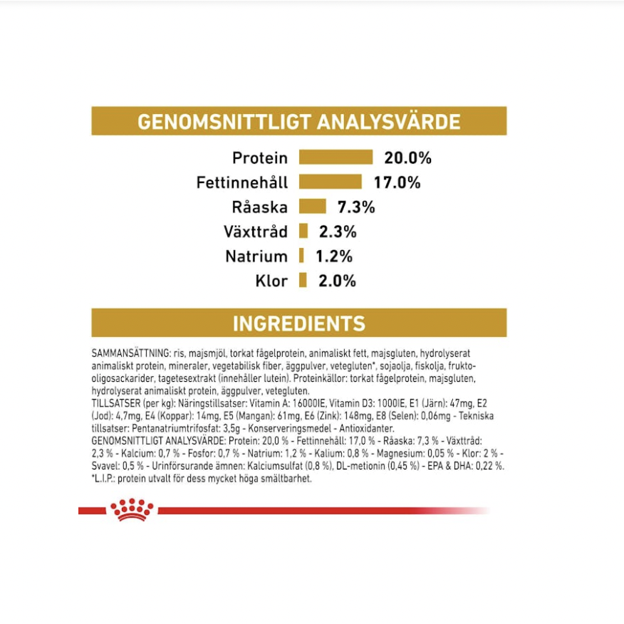 SAMMANSÄTTNING: ris, majsmjöl, torkat fågelprotein, animaliska fetter, majsgluten, hydrolysat av animaliska proteiner, mineraler, vegetabiliska fibrer, äggpulver, vetegluten*, sojaolja, fiskolja, frukto-oligosackarider, mjöl av ringblomma.